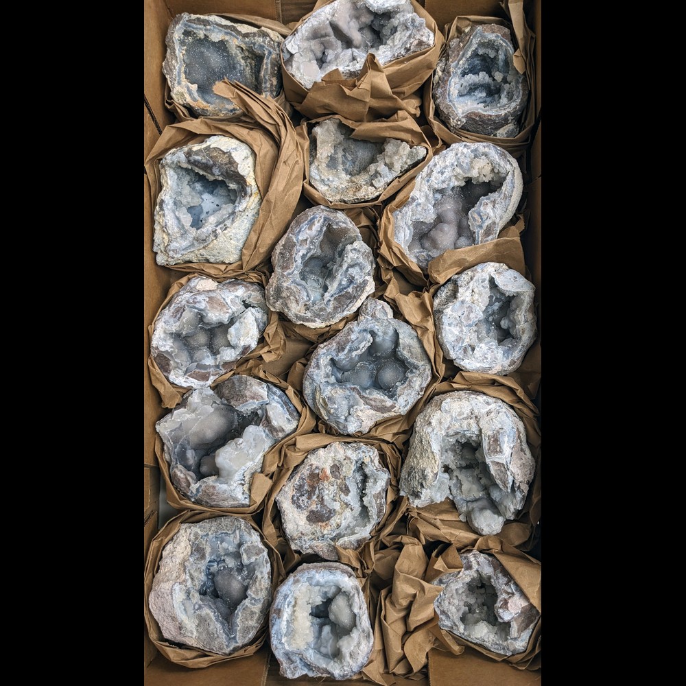 Flat of Fluorescent Dugway Geode Natural Broken Halves. Approximate Size of Geodes are 2.5-4.5 in diameter. 12-20 geodes depending on size. Photo is a representative sample of examples of what you will receive.